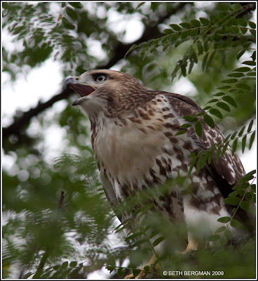 Papa Hawk was calmly preening and resting in a tree when he heard the call of his child. We all heard it, very persistant. The baby found Papa. Scream, scream. Mama arrived. Scream, scream. Translation: I'm hungry. Give me food!!! Both parents did what they knew best, flew away. They know that baby has to learn hunting skills. No lunch from parents this day. Scream, scream, scream, scream, for two hours, scream, SCREAM. There's a result to all the screaming- every edible creature in the area goes into hiding.... no squirrels in sight, no pigeons in sight, no sparrows, robins, mice, etc. Only a couple of beetles and bees, not exactly a hearty meal. I'll post images in two parts, the screaming and later on, the hunting.