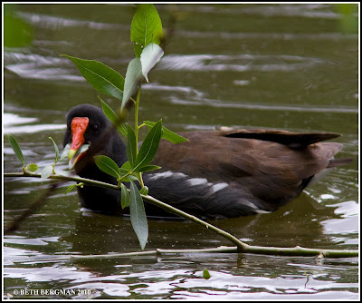 Yesterday was another "didja'" day, this time "Didja' see the moorhen?" The WHAT???? A moorhen?? Never heard of it let alone seen one. Where? Down there. Well, here's a fine bird. I would have liked to have seen it on land, because it has interesting feet. It was going back and forth in one area eating foliage and mucky stuff from beneath the surface. I think it's an ad for Halloween candy corn.