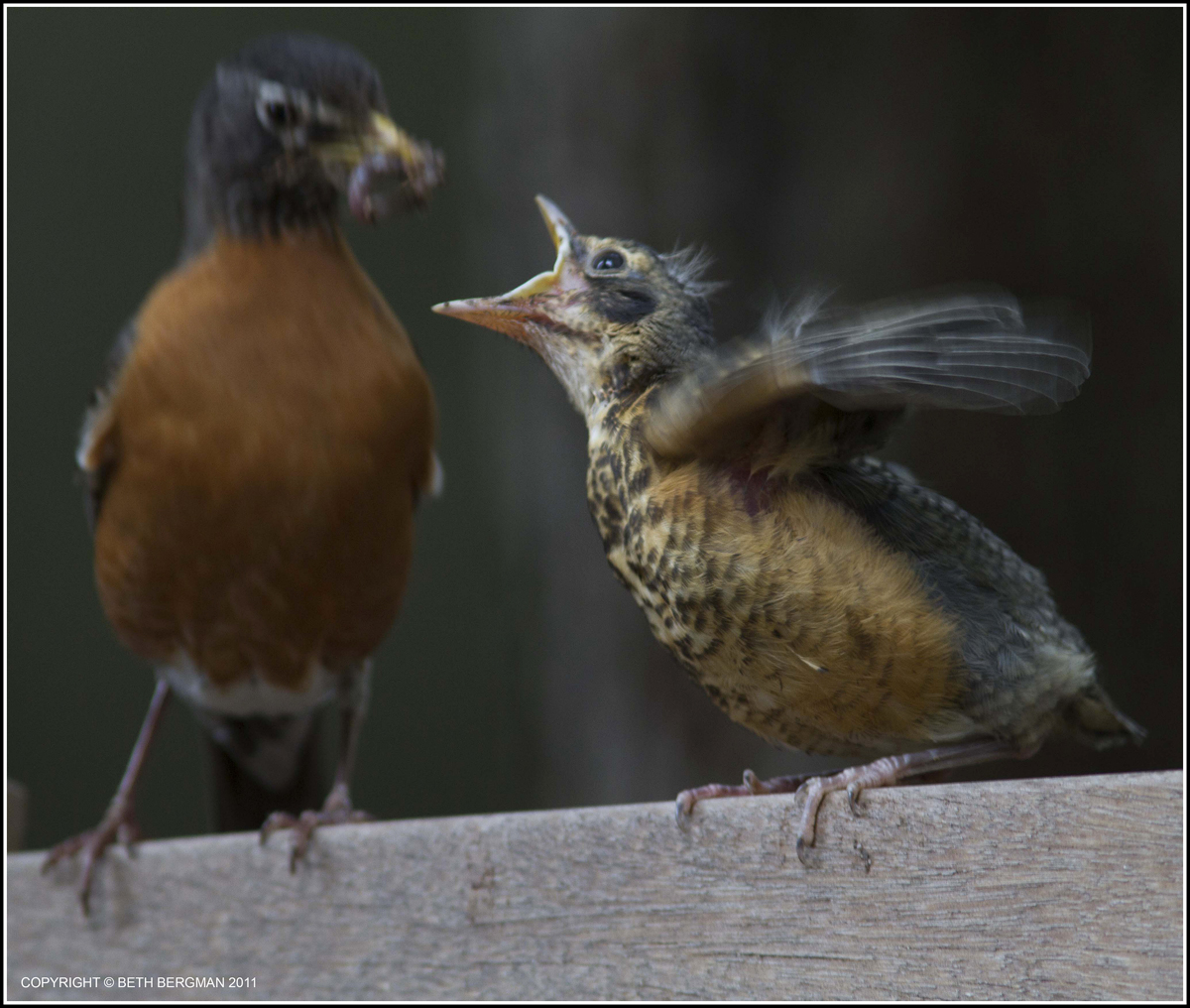 I saw this first-day-out-of-the-nest fledgling around noon when I was headed to a meeting. It was sitting in the garden by the path. I prayed it would be in the same area when I got back two hours later. It was. It had moved down into the bench area and was perched on the back of one of the benches. This is classic new-fledgling behavior, pick a spot and stay put. The maiden flight takes lots of energy. After that it's a matter of getting used to the outside world and all new fledgling robins don't do much flying the first 24 hours. Activity consisted of sitting, dozing, preening, eating, stretching. And looking at camera.