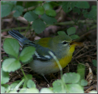 Being in the right place at the right time is a real thrill. The parula chose the bush. I was at that spot and didn't move. Little bird didn't care. The edibles were in the leaves. All I had to do was stand still and observe.