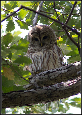 And then the "Biggie", a barred owl, very rare in the park. Before I saw it the owl had been in a couple of trees, moving around in daylight probably due to blue jay disturbance. It was way up in a tree surrounded by leaves, best view straight up.