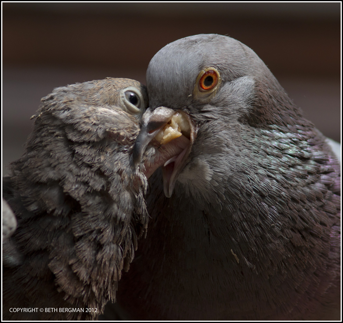 Feeding time. Pigeons feed their babies mouth-to-mouth, regurgitated food. In this case it was no longer liquid gruel. This kid was getting clumps of soft food. How would you like your kid's head down your throat?