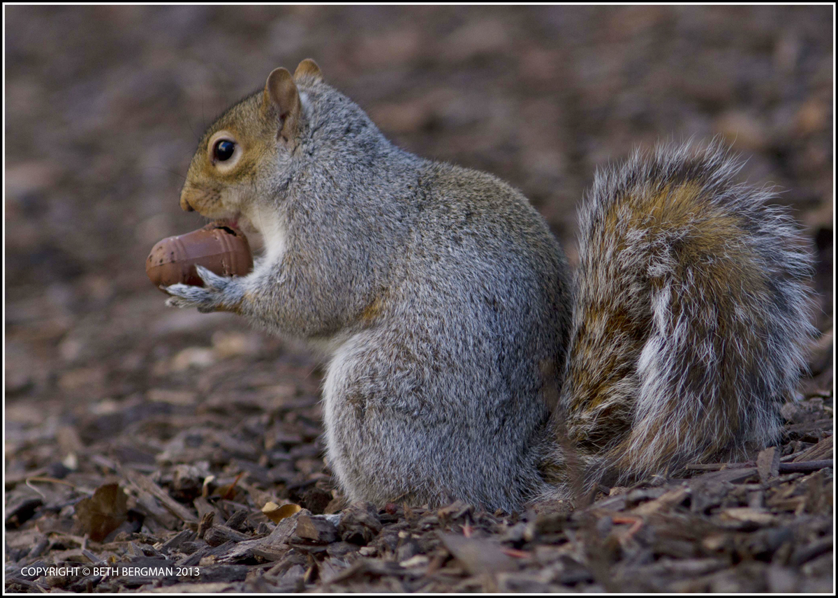 | At first I thought this was a chestnut. Only when I got images into computer did I see this was a hunk of chocolate. This is our resident West End Avenue squirrel. If there's something tasty he'll find it. Chocolate bits on his chest, munch-munch. I didn't want to get too close and have him scamper off. |