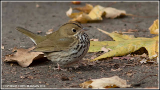 | Couldn't believe this. Usually the ovenbird is hard to see.. always under the leaves, skittish. There had to have been good nibbles under the leaves and on the path. This little fatty didn't mind that I was standing and watching. This never happens, out-in-the-open ovenbird. What a well fed sweety. |