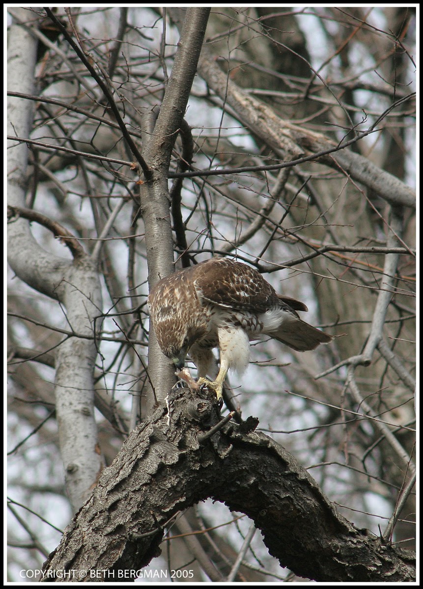 | A hawk lover had tied raw chicken breast to a limb. "I want to help the babies", she explained. Oy!!! Not a good idea. |