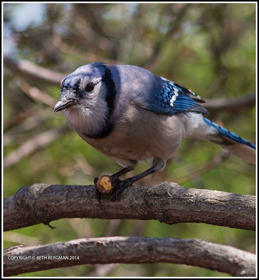 | Bluejay found an acorn and worked the shell placing nut bit on branch |