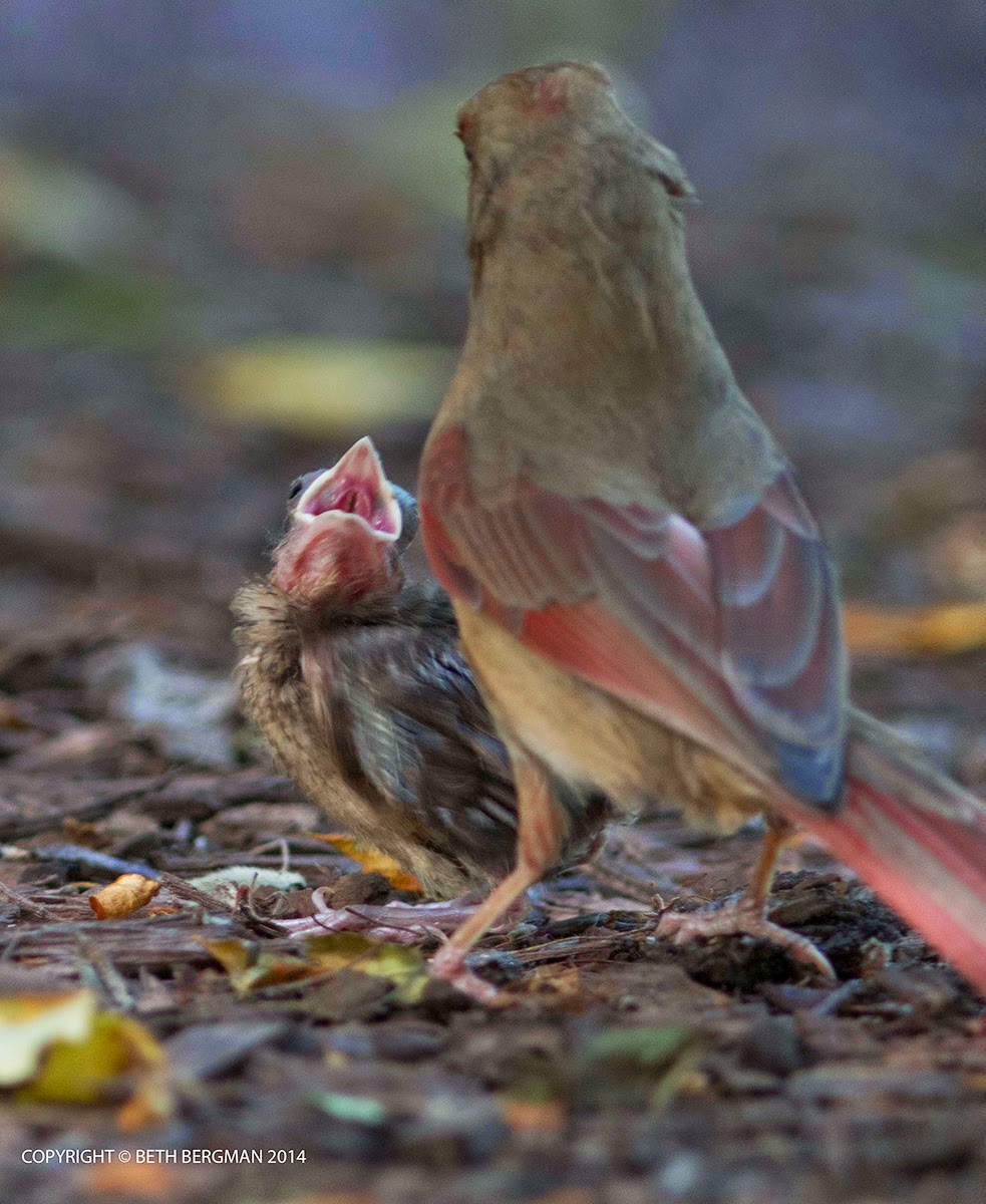 Two hours later. Baby had flown down from the horizontal branch it had gotten to the base of another tree and was doing proper baby cardinal stuff. A baby cardinal is so ugly that it's adorable. You can't not love the facial expressions. |