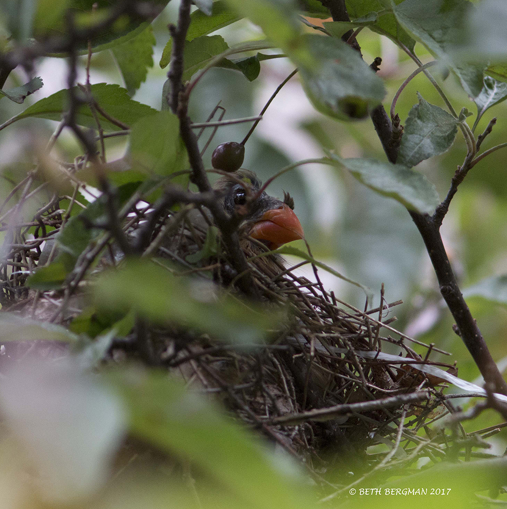This is a wonderfully secluded nest. I have to peek through branches in next tree in order to view anything. Papa (Mr. Molty), at nest. Attentive.