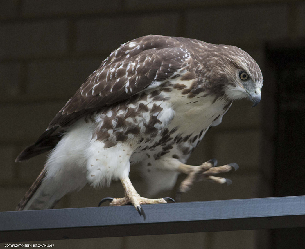 Every small bird in the garden vanished yesterday afternoon. Visiting young redtail hawk on the prowl for food. Second floor balcony chosen for visual hunt. Total delight for neighbors.