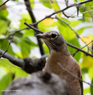 There's competition for berries, territorial, fierce fights sometimes, so the birds are wary. The catbird on alert.