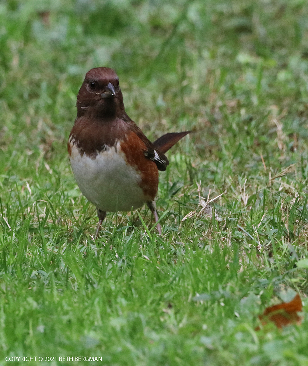 Oh, goody! A male towhee. They love to dig under leaves, but they're skittish. This was one uncooperative male.